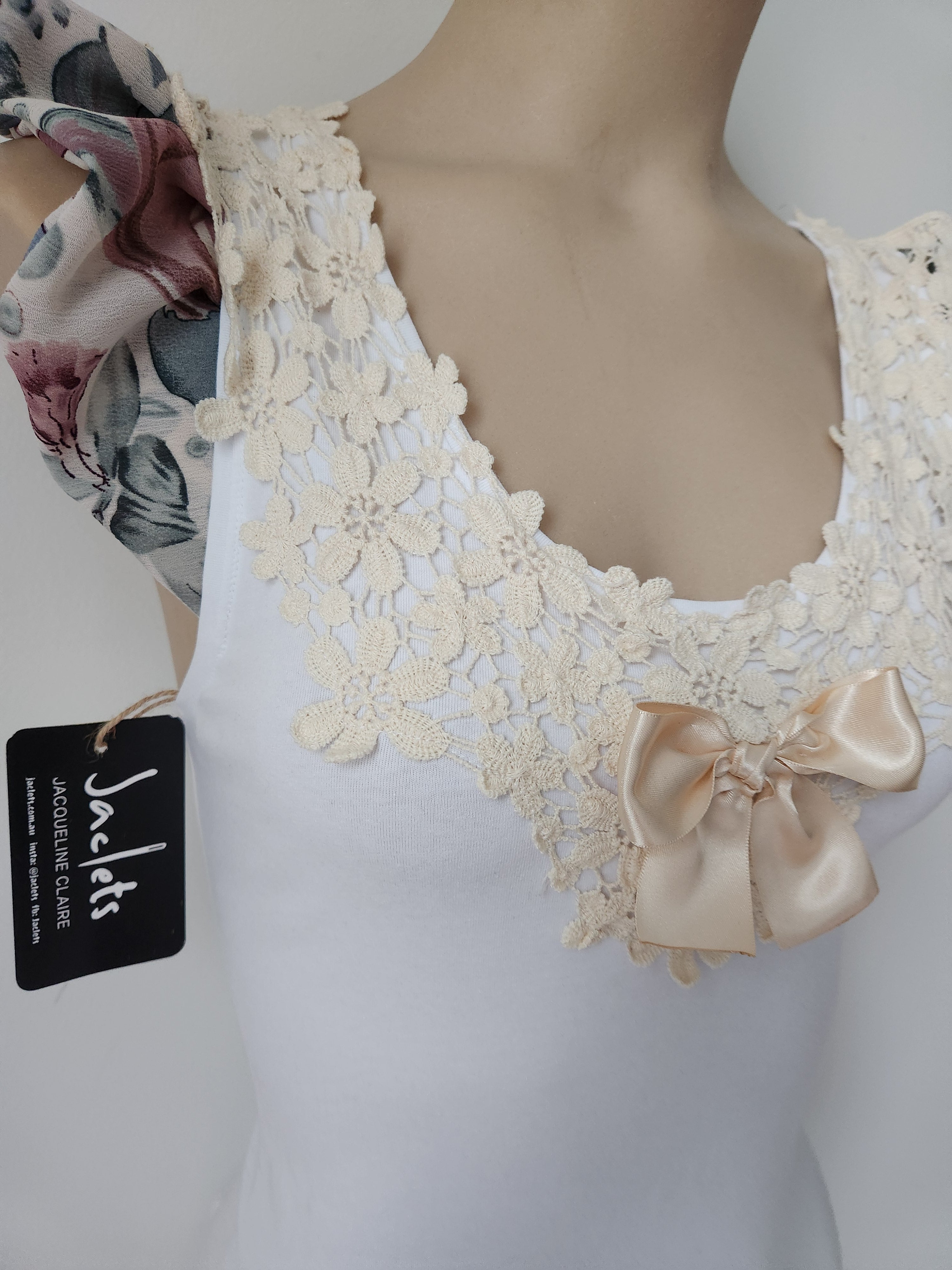 Romantic and feminine, this handmade top brings a touch of vintage charm to your everyday wardrobe. the top is made from soft stretchy cotton elastane, it features delicate crochet lace across the neckline, and is finished with a satin bow for added detail.