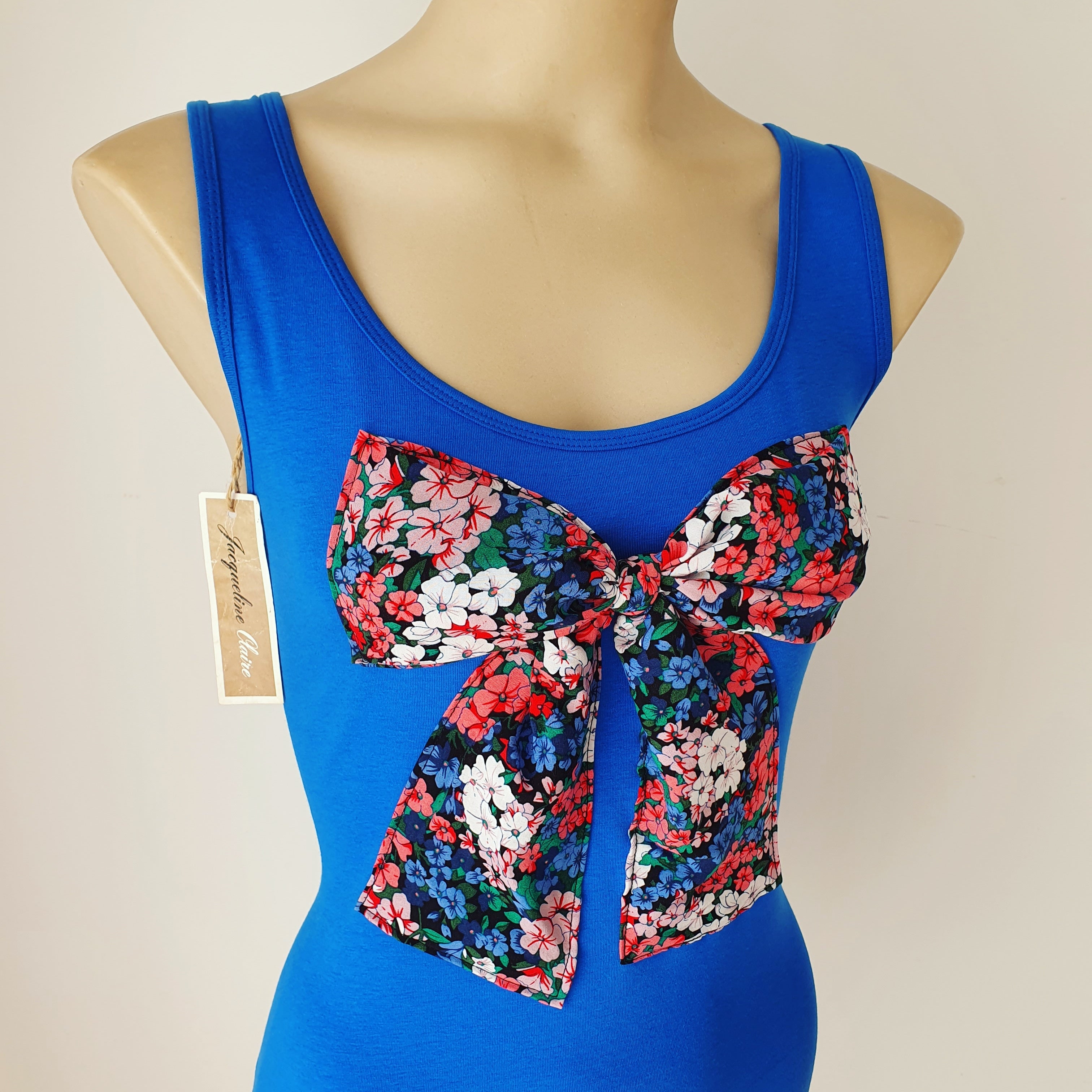Cobalt blue top with gorgeous floral bow. The top is flat and stretchy cotton elastane fabric and sizing is normal, not large or small.