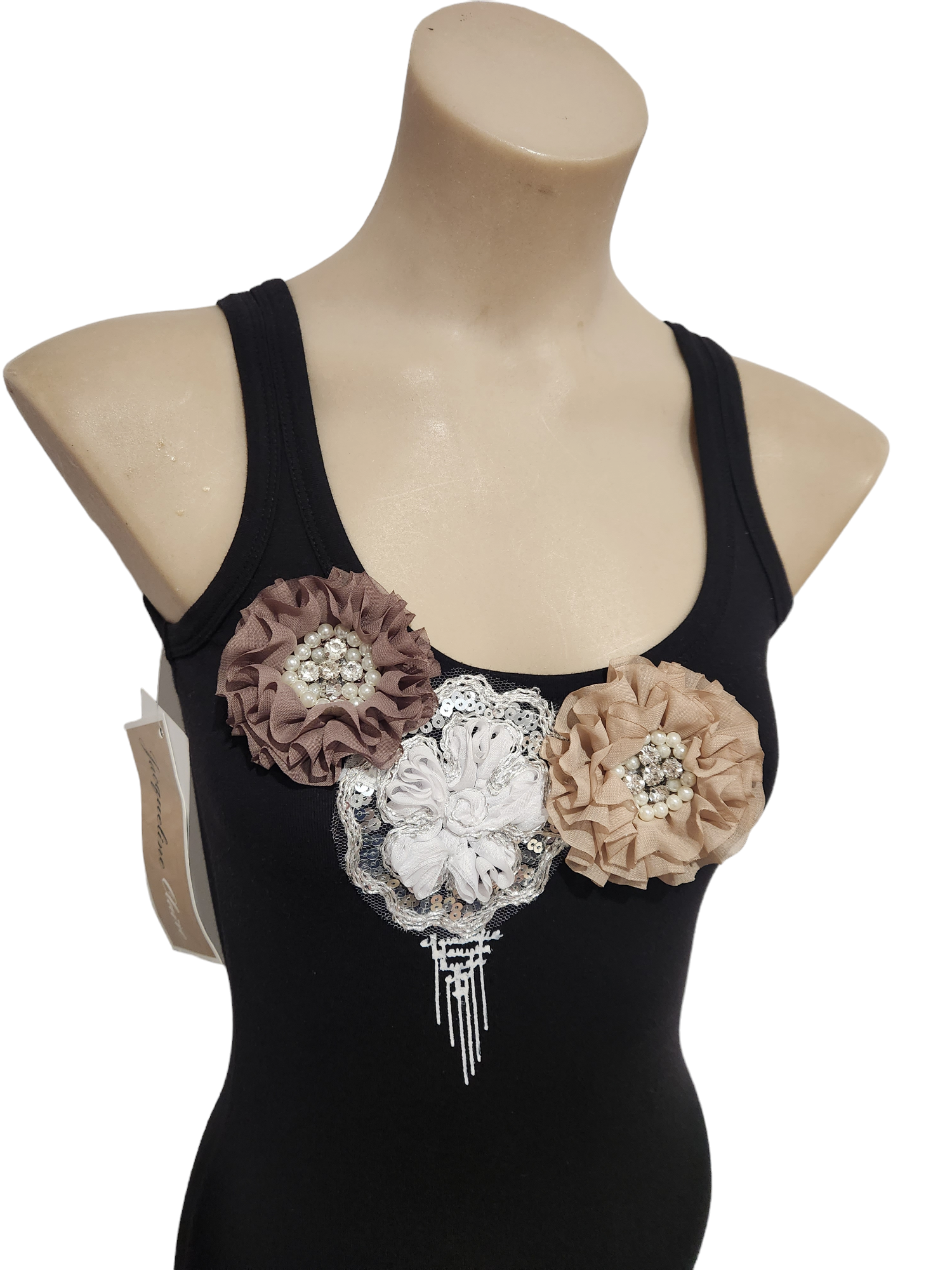 This gorgeous top has mocha brown and tan flowers with white and silver, and little white French poetry detail.