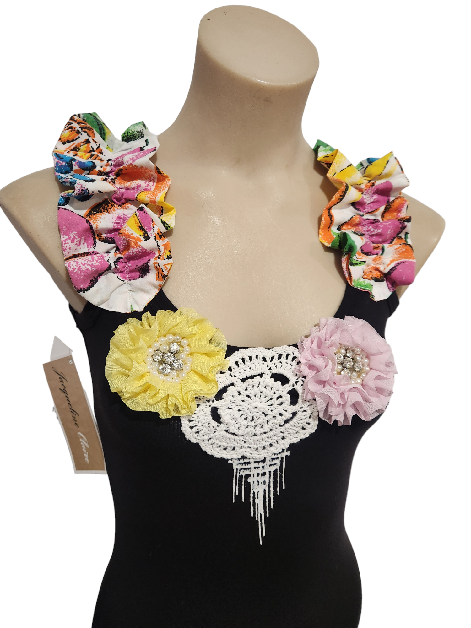 Such a gorgeous piece with the ruffled shoulders and pink and yellow flowers. The top is flat and stretchy cotton elastane fabric and sizing is normal, not large or small. To wash, turn it inside out and pop it in a bra bag to best look after it. Cold/delicate machine wash and line dry. Handmade in Brisbane.
