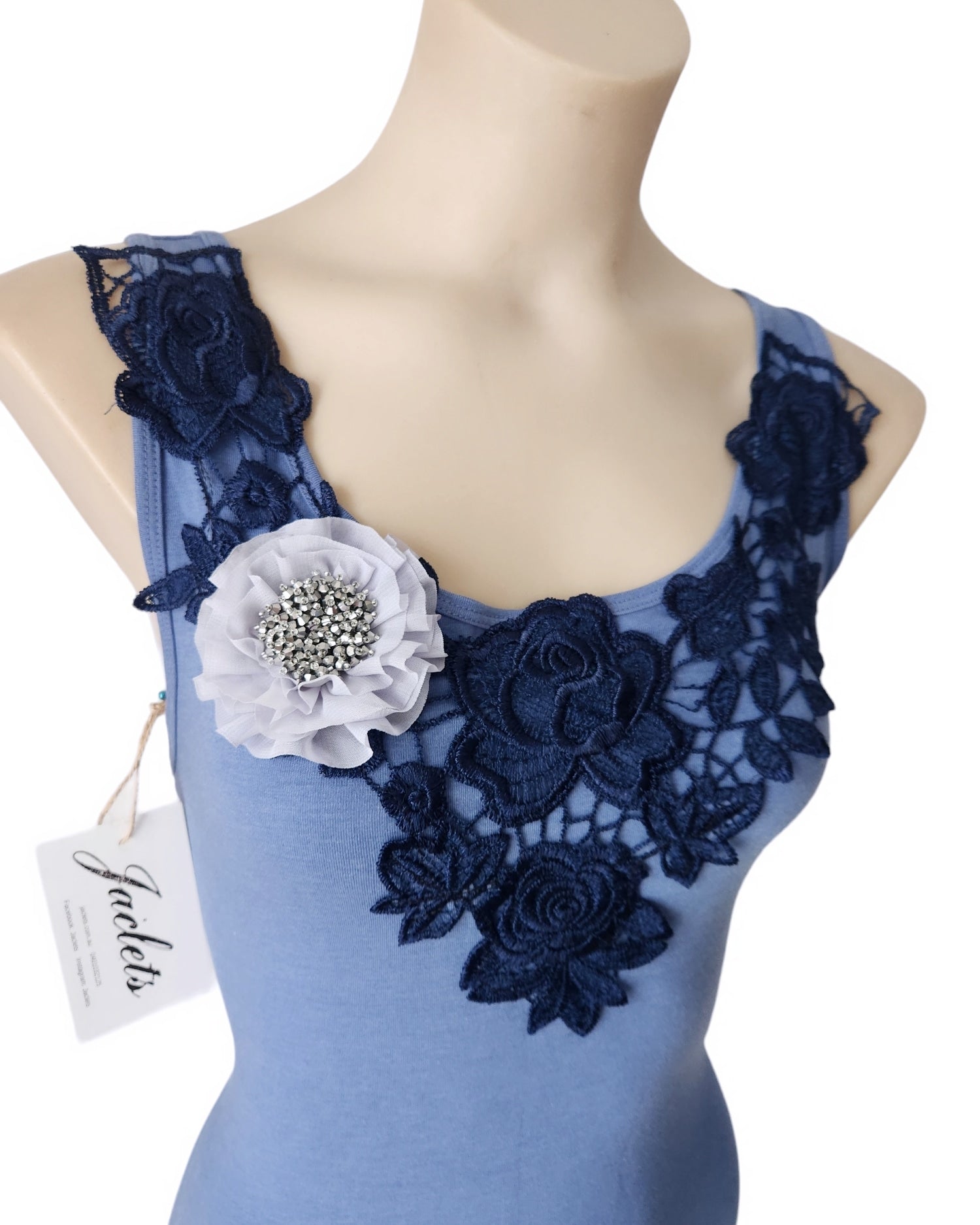 This blue and navy piece is a one of a kind, and is a size 12. The grey ruffle flower and bead piece have been perfrctly handsewn in.