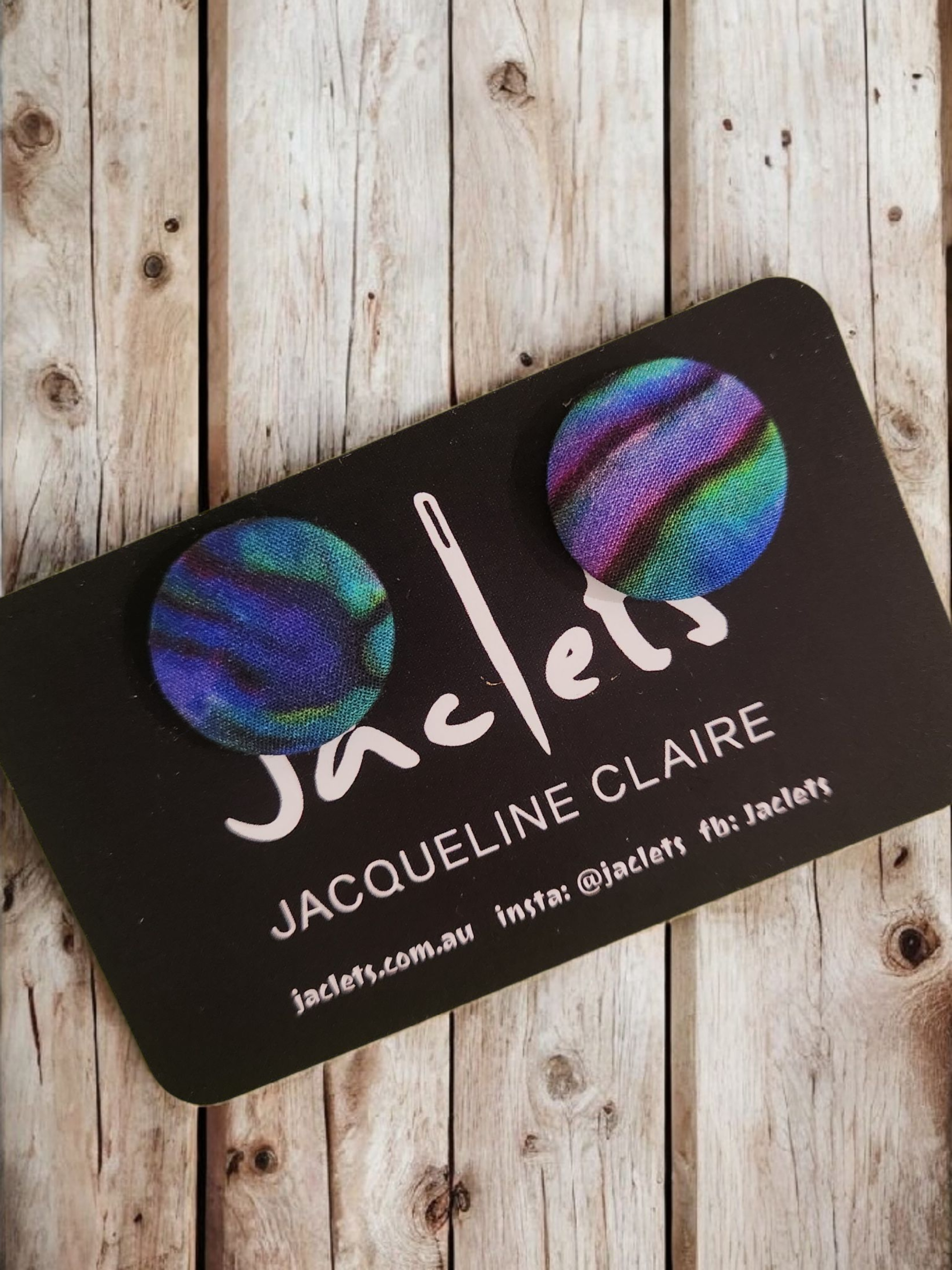 Beautiful blue, black and green, such a gorgeous print to wear. Size 23mm with surgical steel post and butterfly back.