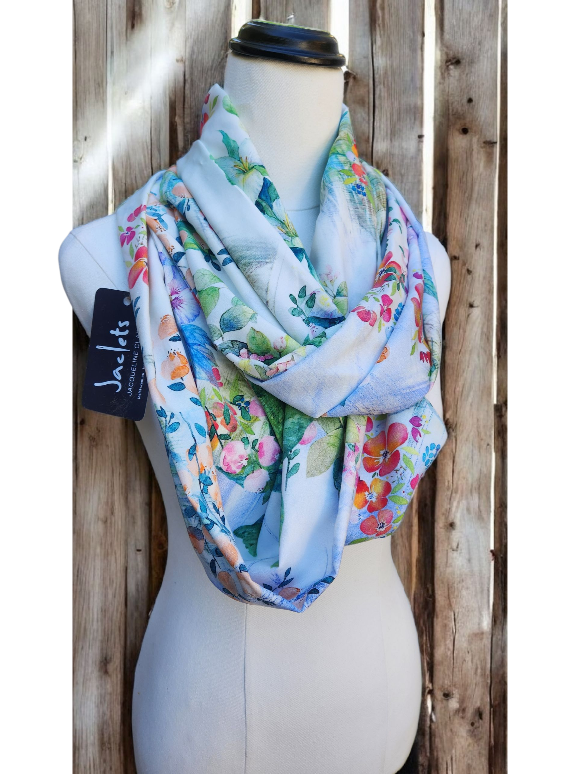 This beautiful print is watercolour scattered oranges and flowers and it's oh so pretty. It's made from beautiful quality rayon fabric so its lovely and drapey for the loop shape. The single loop is about 100cm long and gets looped twice around your neck so it looks as pictured when worn. Machine washable in a bra bag and fabric can be ironed. Line dry.