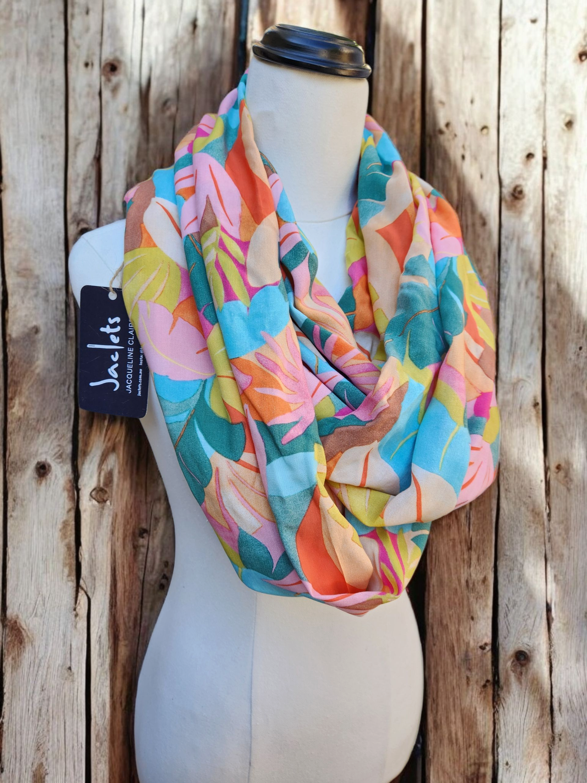 Coloured printed leaves make this one a great piece to pair with all different plain coloured tops! It's made from light soft rayon fabric so its lovely and drapey for the loop shape. The single loop is about 95cm long and gets looped twice around your neck so it looks as pictured when worn. Machine washable in a bra bag and fabric can be ironed, and line dry.