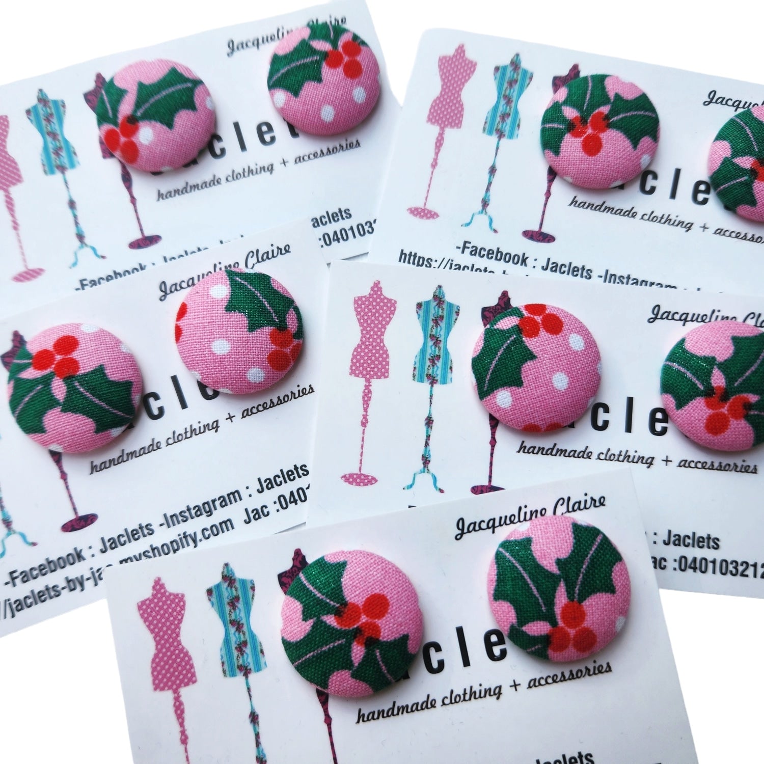 Adorable little pink polkadot fabric with holly print. These are 23mm sized studs, and they have surgical steel backing and post.