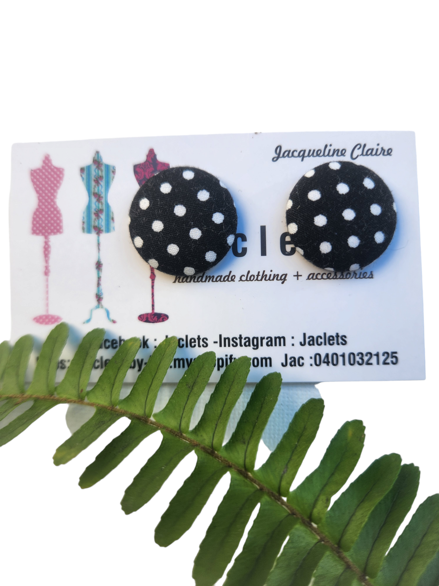 Black and white polkadot studs, 23mm size. Surgical steel backing.