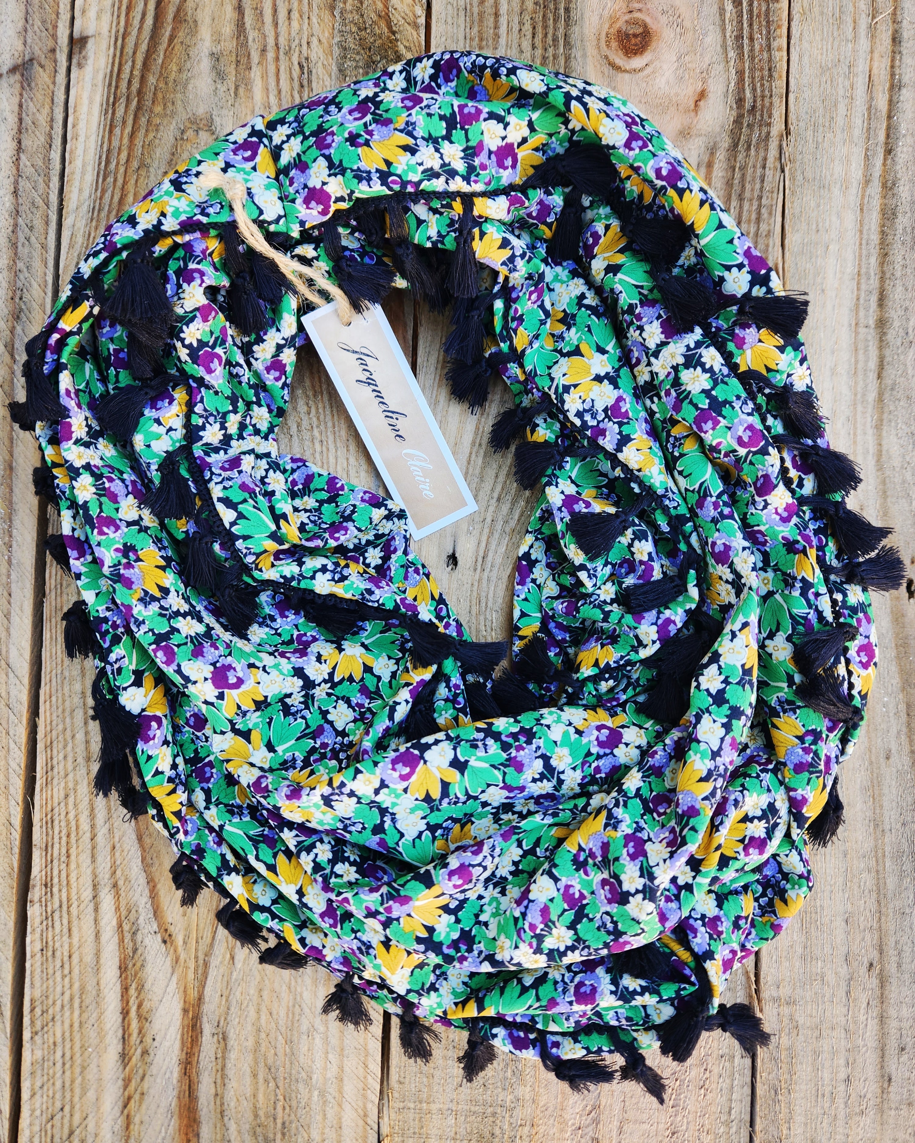 The colours in this one are black, green, lilac and mustard. Light soft rayon fabric so it's nice and drapey. The single loop is about 100cm long and gets looped twice around your neck, or wrap it 3 times if you'd like it sitting higher up.