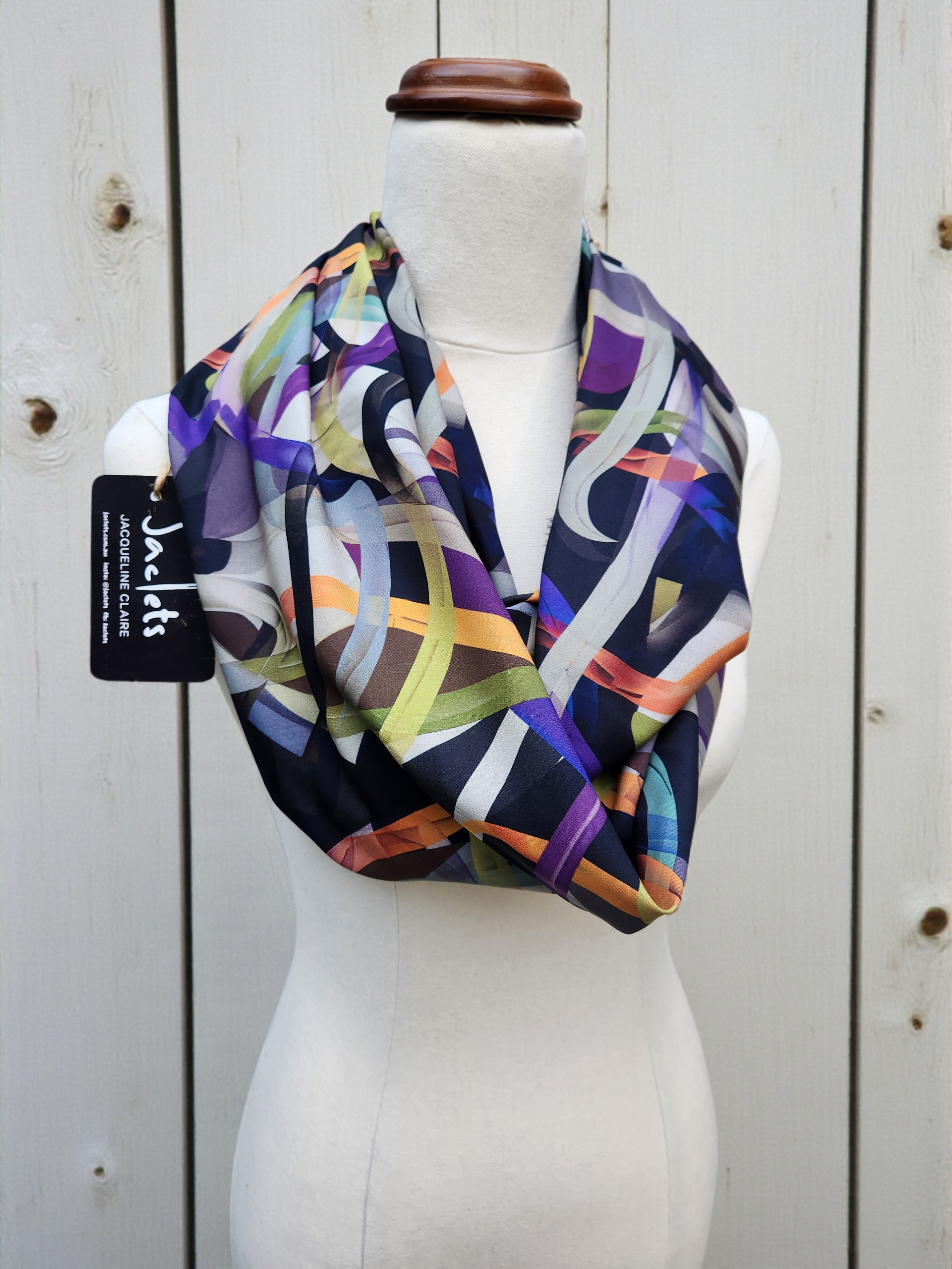 Designed to bring colour, movement, and personality to even the simplest outfit, it features a striking abstract print with rich layers of navy, purple, olive, gold, and soft neutrals.