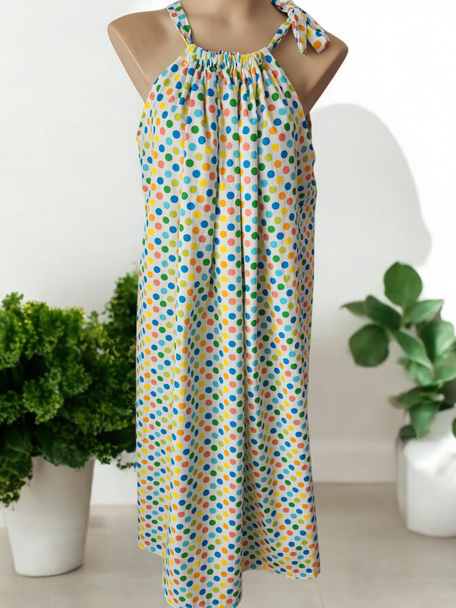 It fits from sizes 10-16, it's a midi-dress (middle of shin length), and it's made from cotton fabric. It ties up so its adjustable.