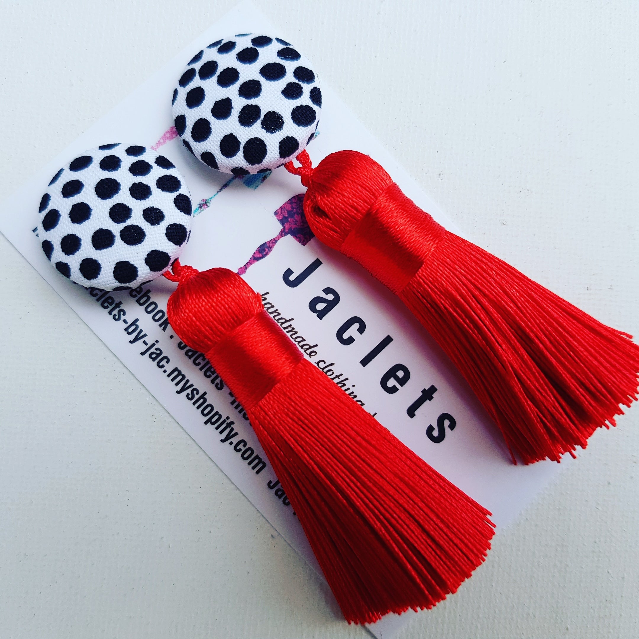 White and black fabric stud with vibrant red tassels. Total length about 9cm. Nice and lightweight, won't pull your ears down. Surgical steel post and backing.