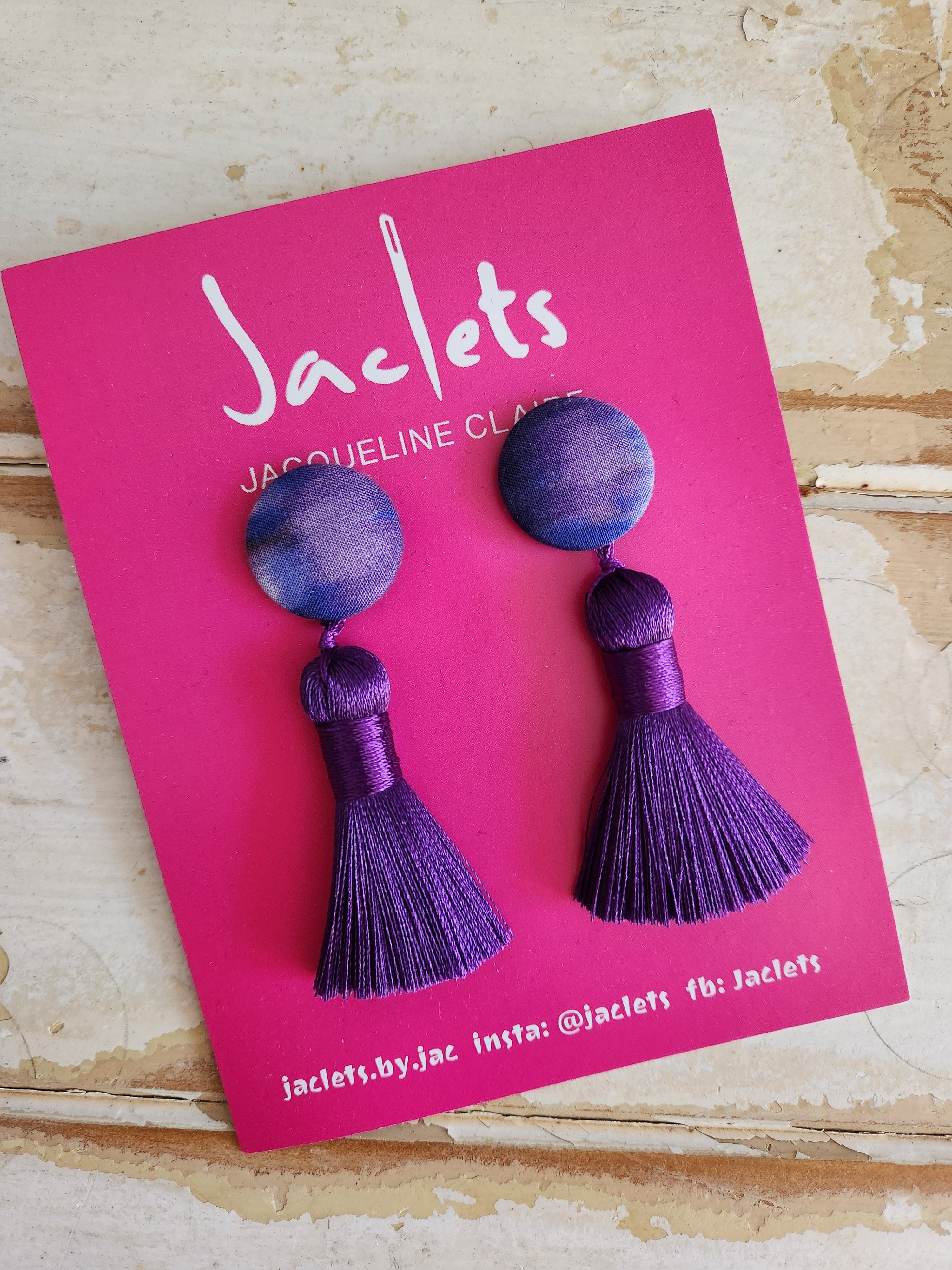 One of a kind, this pair has a purple-blue fabric stud with matching purple tassels. Great for adding a pop of colour, or if you're a purple lover.
