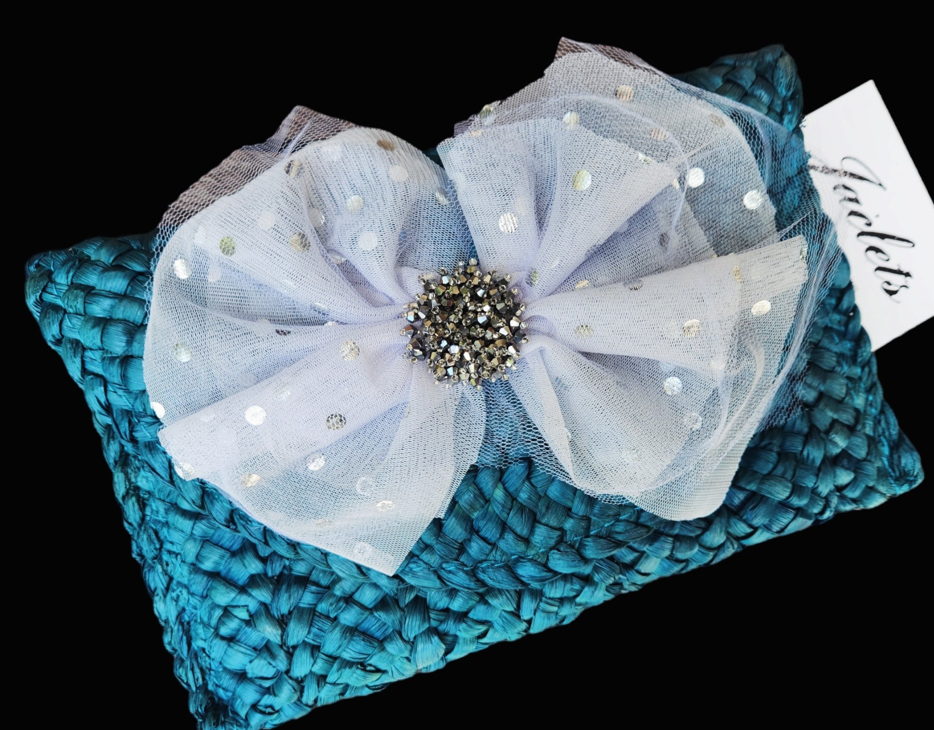 The handmade tulle bow on this bag makes it extra soecial. This is such a cute little piece to take out to dinner! It's pretty and fun and grabs attention. It's 28cm long and 18cm high, and clips closed under the flap.
