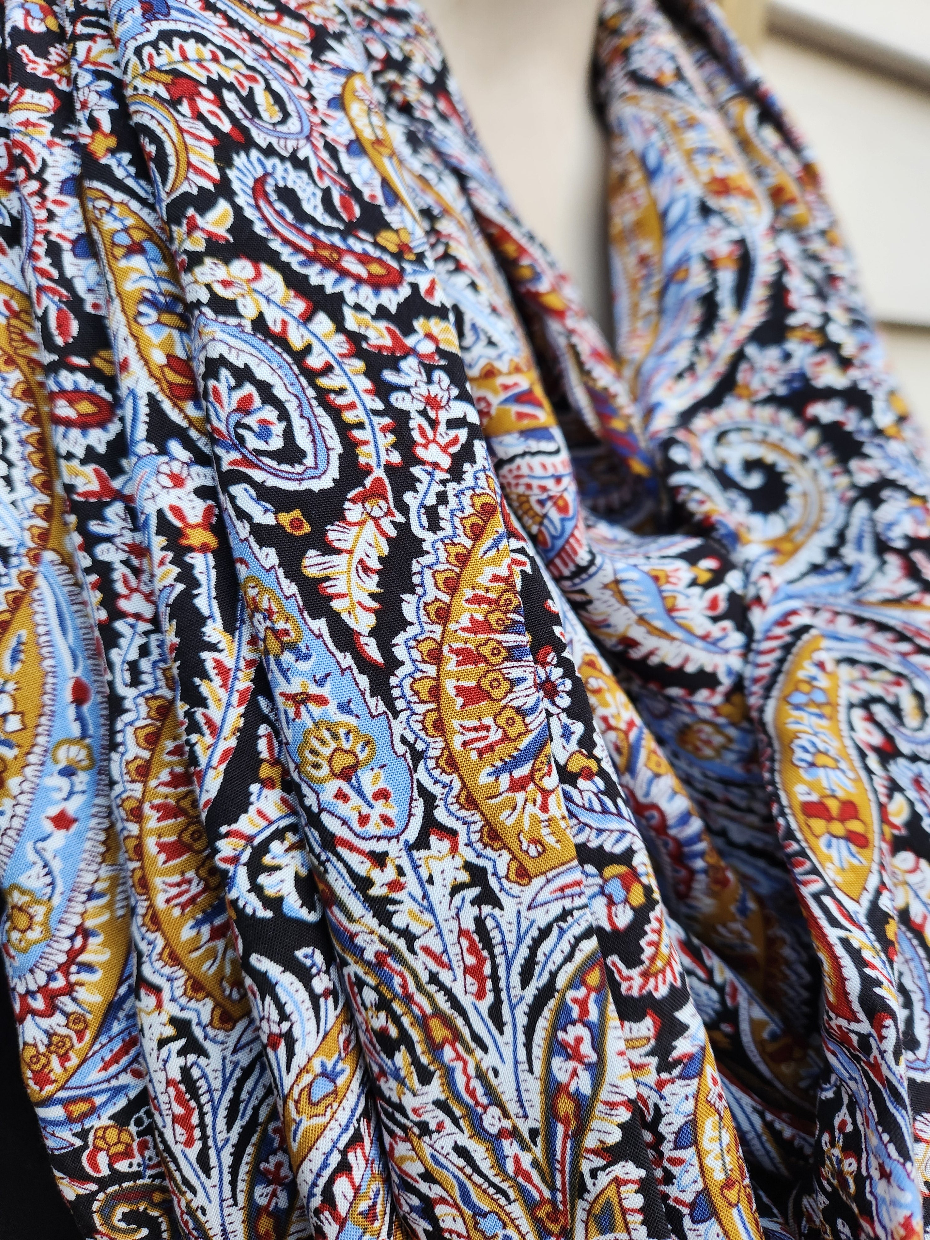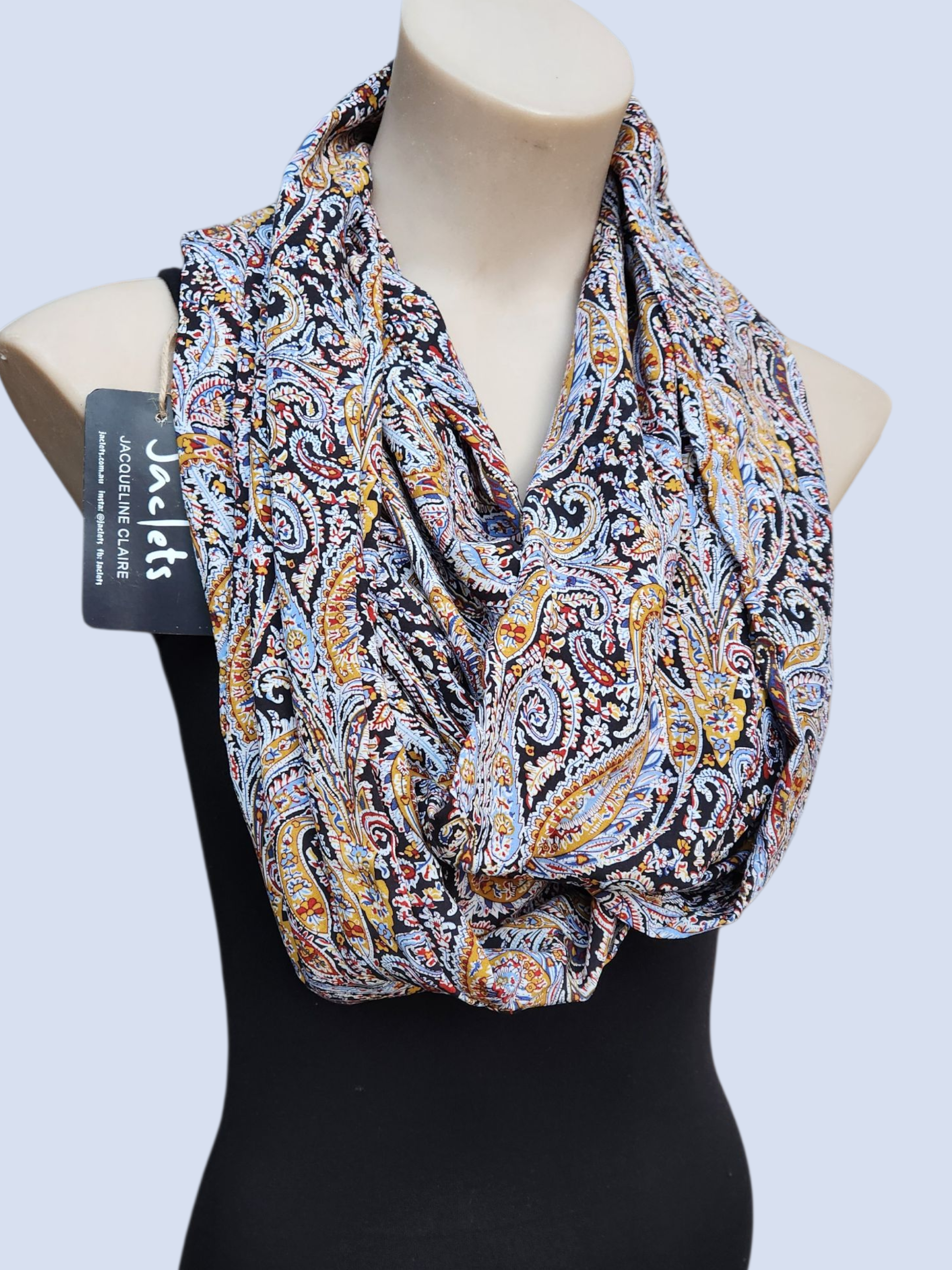 This is an intricate little paisley print set against black with pops of mustard, rust and grey. The fabric is light soft rayon fabric so its lovely and drapey for the loop shape. The single loop is about 95cm long and gets looped twice around your neck so it looks as pictured when worn.
