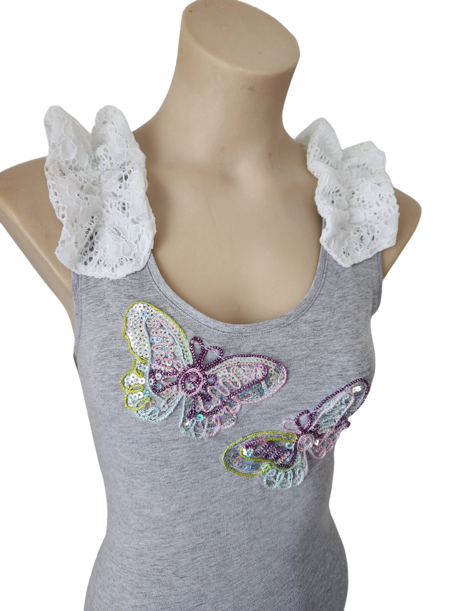 This gorgeous top has soft white lace ruffle shoulders and little coloured butterflies across the front.