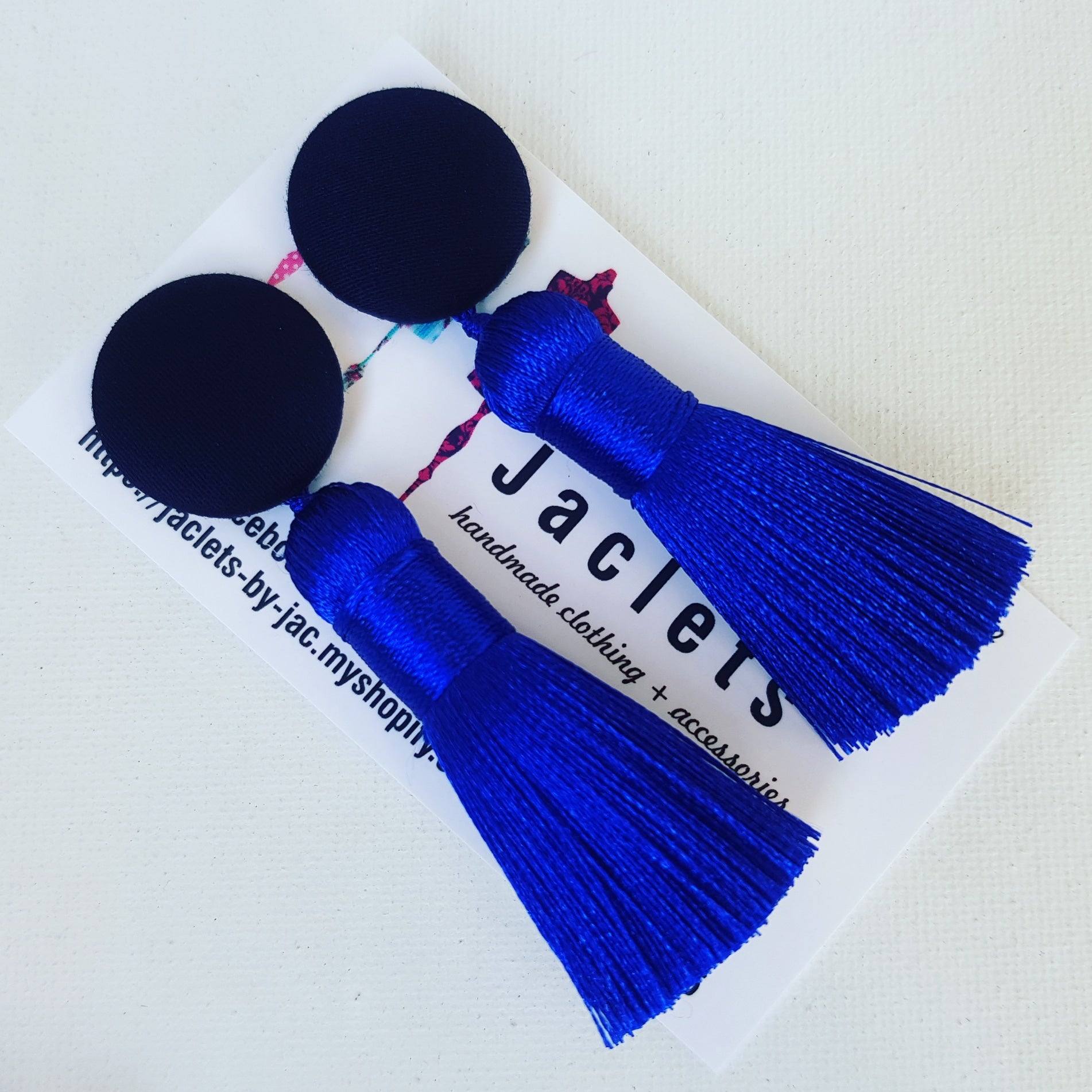 Navy fabric stud with vibrant blue tassels. Lovely and light, about 8.5cm total length.