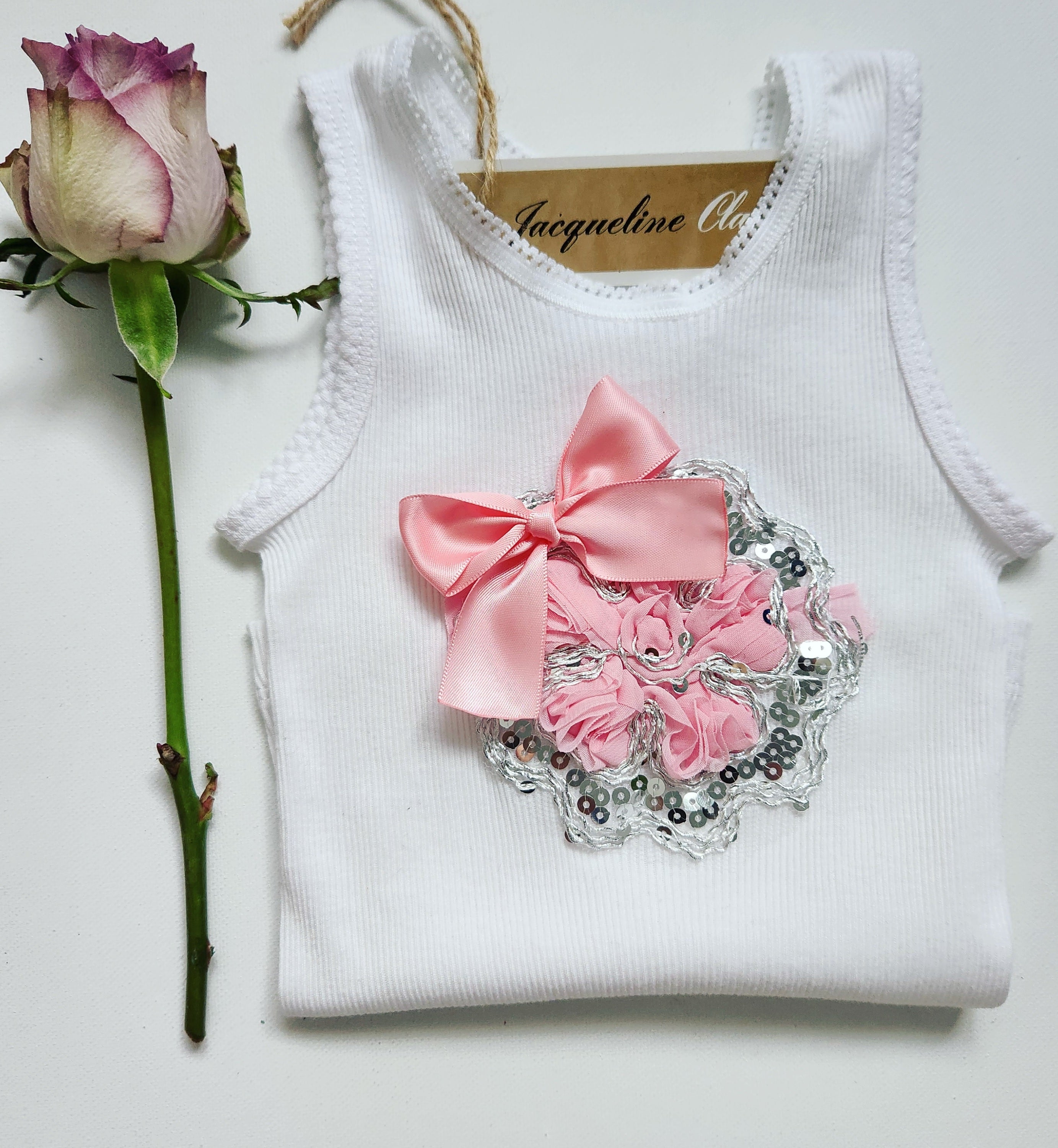 Little white cotton singlet with pretty pink and silver design and handsewn satin bow.