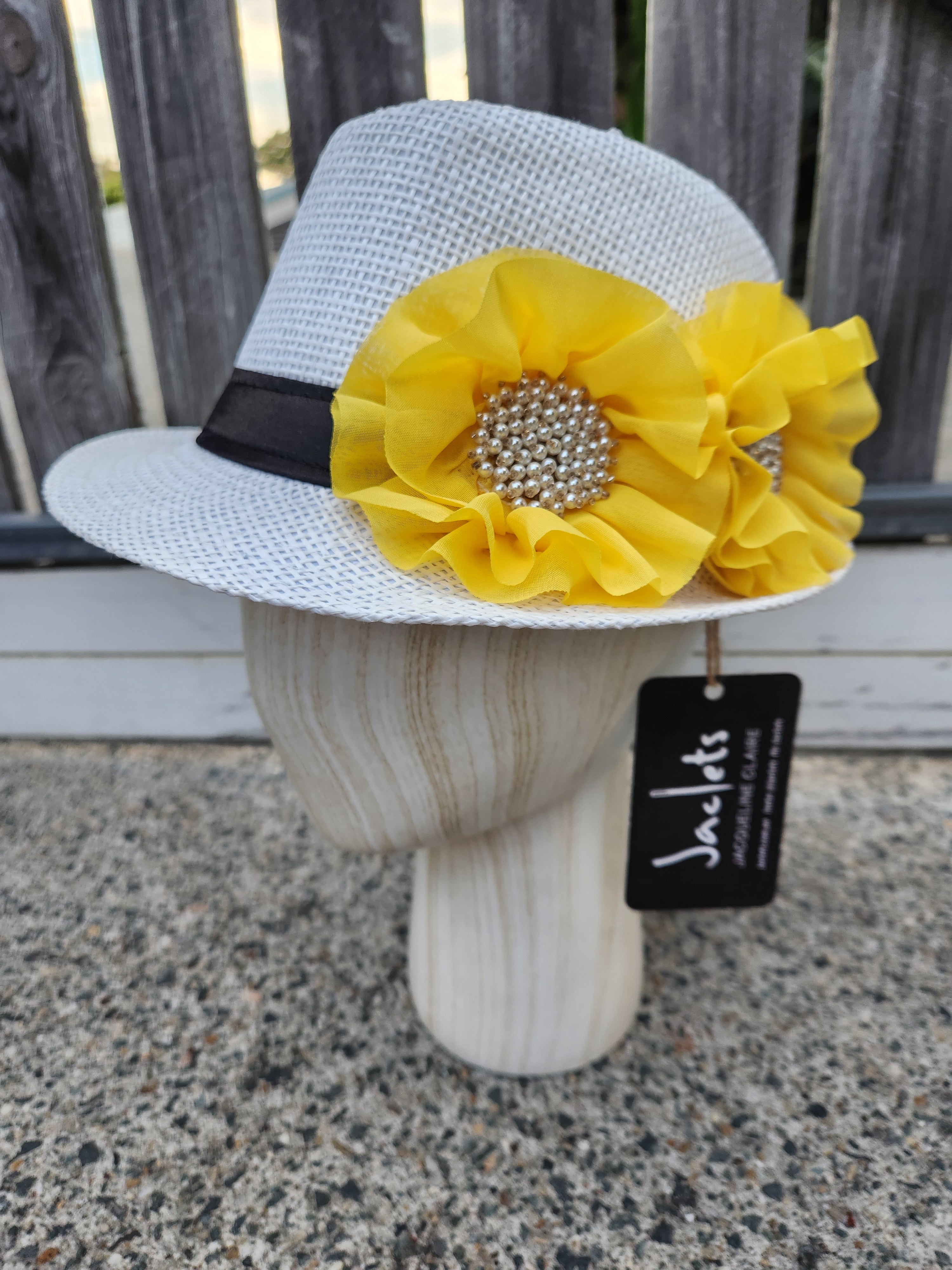 White with sunny vibrant yellow flowers with pearls and gold beaded centres.